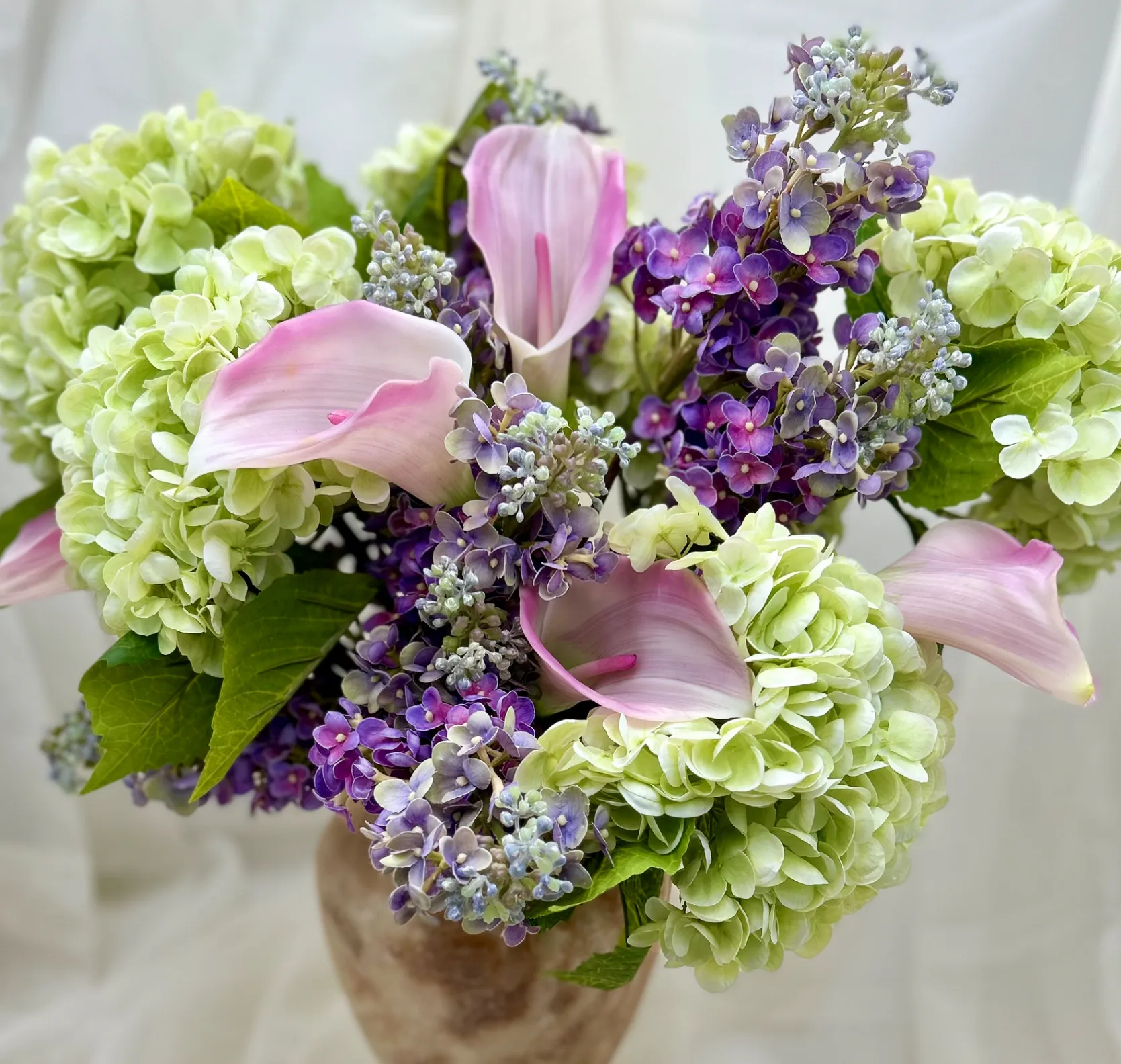 Purple Lilacs, Pink Calla Lilies, and Green Hydrangeas