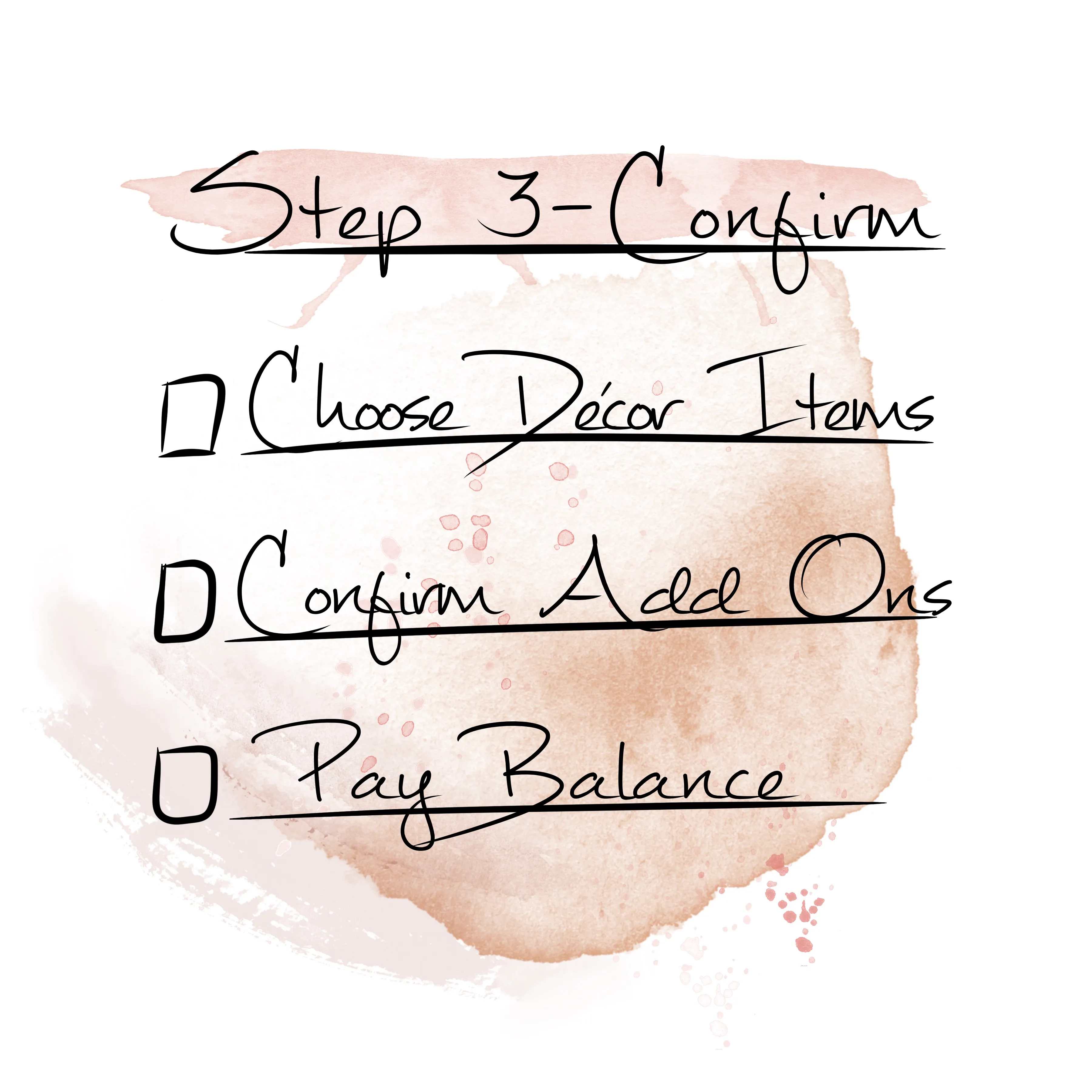 • Make a payment via a secure payment link to finalize your reservation. A minimum 50% deposit on your rentals/services plus a returnable 15% security deposit is required. If your wedding or event is less than 2 months away, your full payment is due at this time.