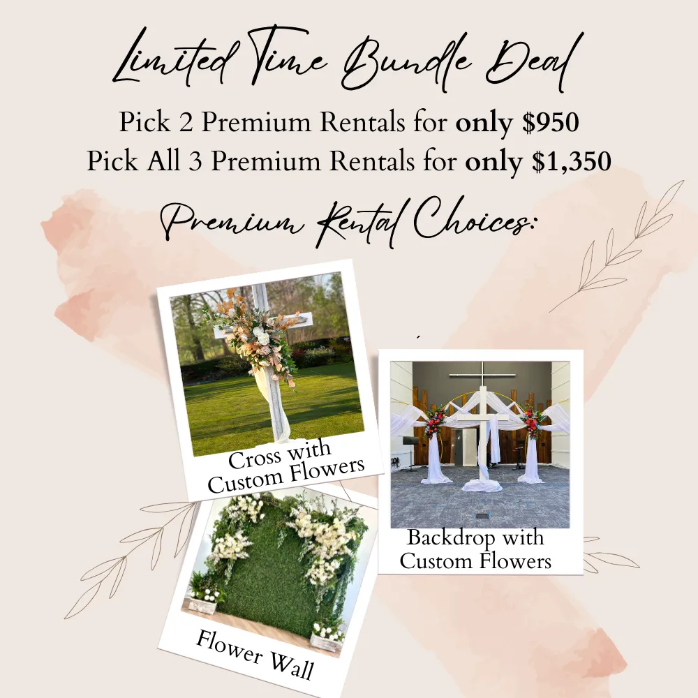 To qualify for this special, you must reserve a premium rental at regular price. Premium rental choices are flower walls, statement backdrops with drapery and custom florals, or altar crosses with custom florals.