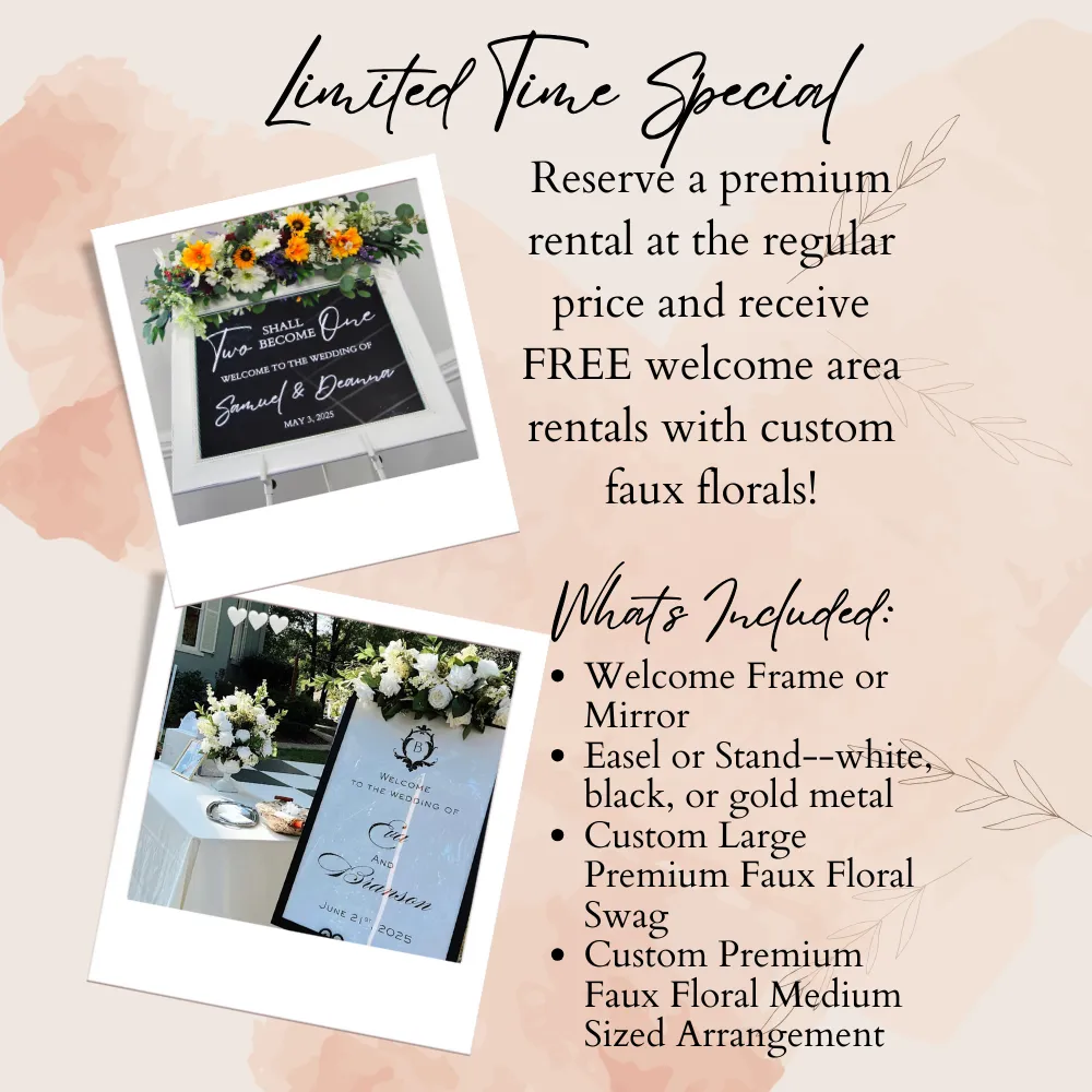 We have many welcome sign options to coordinate with your wedding style--from elegant mirrors, to a classic frames, to modern metal stands, to rustic chalkboard style signs. We also have many styles of easels to choose from.