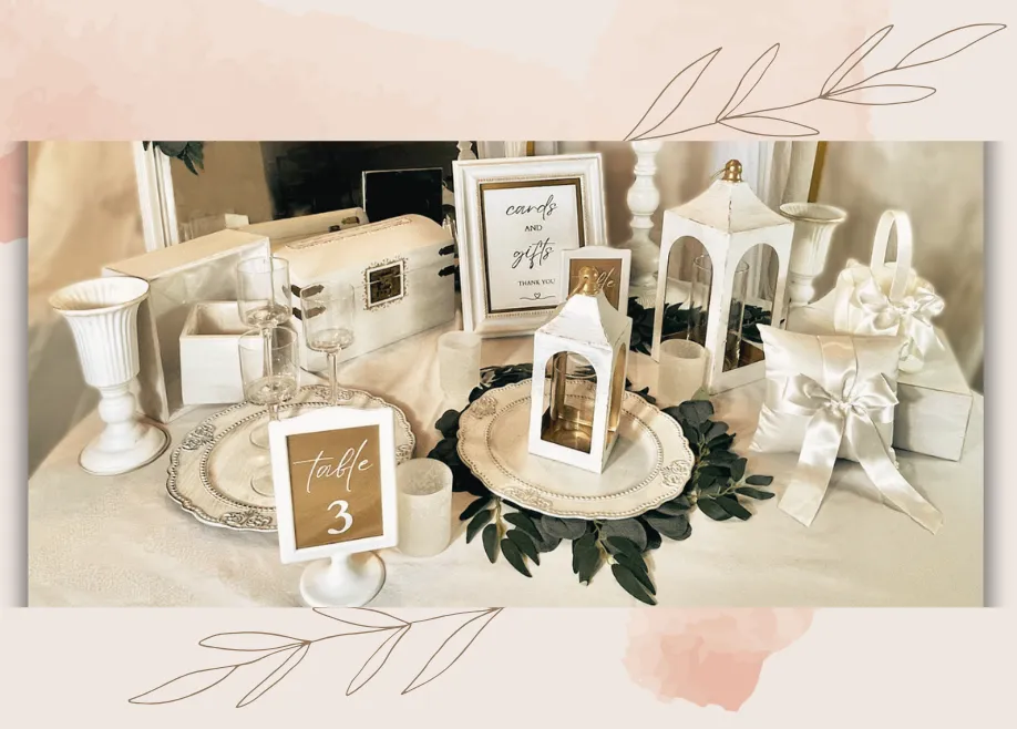 When you rent a décor collection, you'll also gain access to individual rental items from our add-ons and premium faux flowers collections. Plus you'll receive our special two free Double Blessing rentals, and a free bridal shower rental! Learn more about our complimentary rentals on our "Why Us?" and "Bridal Shower Rentals" pages.